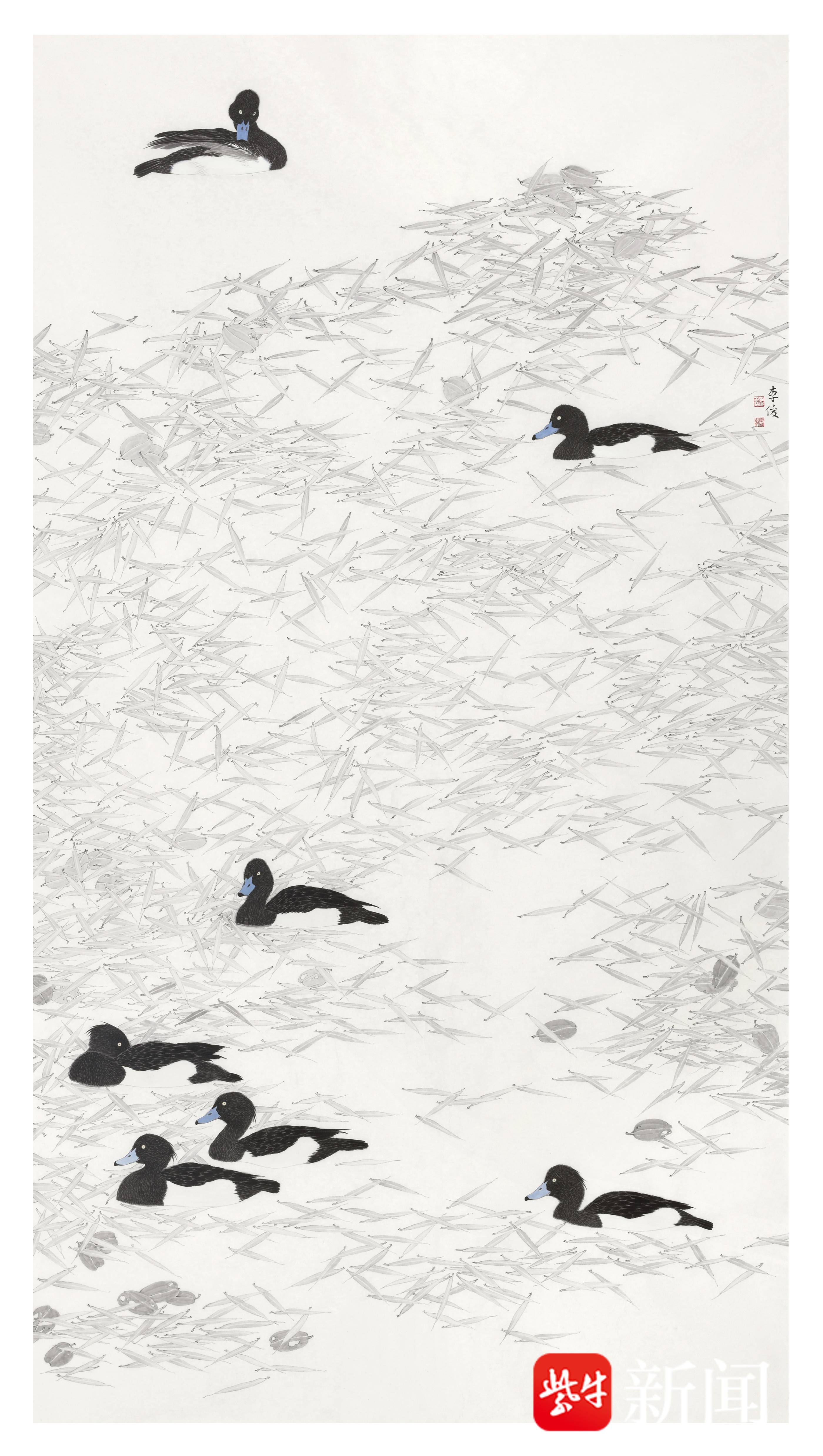 李俊的构图更是突破传统折枝花鸟的局限,如《菱塘鸭戏》采用S型构图,雏鸭的破墨点染与菱叶的横扫笔触形成疏密对比,叶梗细劲如丝却带水波颤动,全然是溱湖晨雾中得来的“活态”,将自然生机转化为视觉节奏。