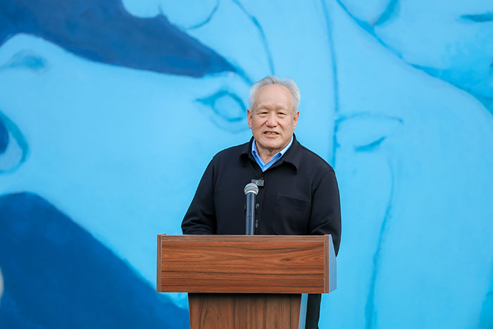 覃川在致辞中表示,从“心向天宇”的展览作品,可以看到刘巨德先生把美从人性和自然的最深处不断的挖掘和展示出来。他传承了清华美院装饰艺术的传统,把西方的现代艺术和中国的传统艺术相结合,在比较中寻找它们的共同点,在相互对话当中探索新的艺术发展方向。刘巨德先生在“为艺”方面“自然纯真、天人合一”,在“为学”方面“无问西东、融会贯通”,在“为人”方面“自强不息、厚德载物”,始终以赤子之心追求艺术理想,为清华美院的艺术教育贡献了独特力量。