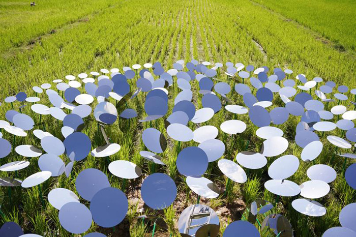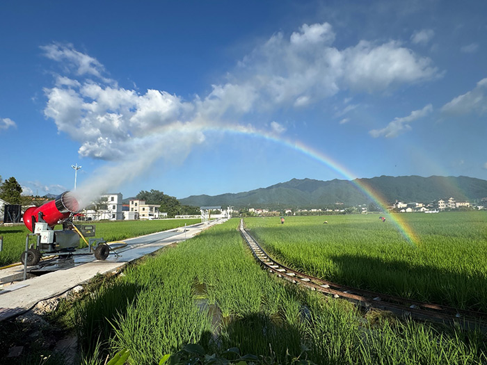 另一件极致“浪漫化”的作品是杨千的《虹》,艺术家通过与技术工厂的深度合作,将工业设备(造雪机)改造为一座精密的“彩虹发生器”。当红色的圆筒喷薄出大量水雾时,阳光照射在水幕之上,就形成了一座跨越在稻田上方的彩虹,作品展示出冰冷的工业技术同样可以在艺术家的巧思和想象中转化为自然的奇观与诗意。