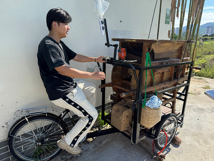 而在《稻田里的谷风兽》中,刁勇将农家即将废弃的谷风机改造为可骑行的“谷风车”。传统谷风机原本是一种静默的农具,功能只是“分离谷粒与秕糠”。艺术家为其加装自行车轮胎,使它获得运动的属性:骑行于稻田之间,仿佛在筛选田野的风与记忆。农耕时代静默的生产工具,经过艺术家的巧思,被重新赋予连接传统与当下的情感力量。