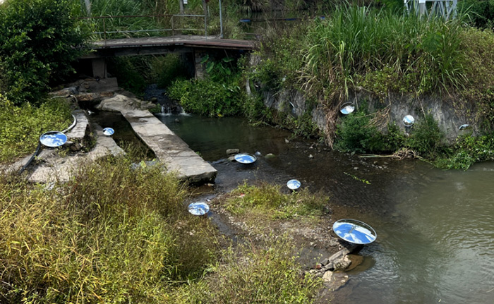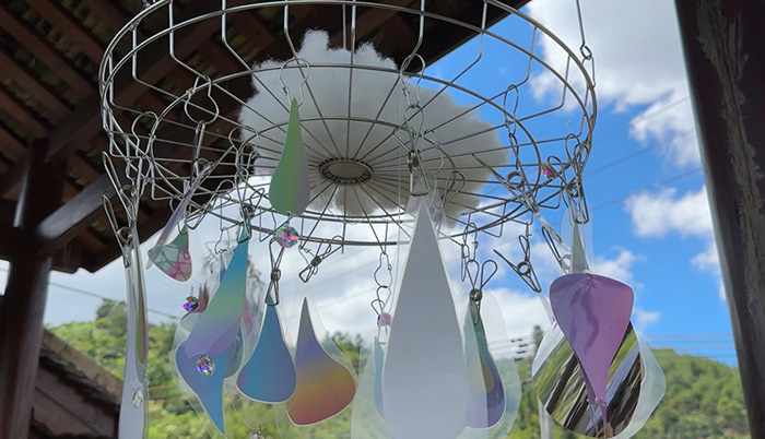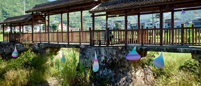 艺术家詹海蕙感受到蕉岭自然风物的魅力,在高思村泉水桥这座古桥上搭建了一座云朵与水滴的剧场——《悬置的仪式:幸福的微观宇宙》,她以“衣架”悬置封装石窟河水的彩色水滴、折射光线的棱镜、微缩大自然的镶嵌玻璃、飘逸的云絮。作品似乎邀请过桥者暂停脚步,透过一滴水看见倒映的桥影,触碰光影引发波动,在凝视中体验“此刻”的充盈。