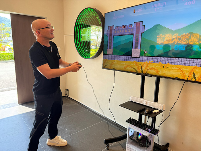 在米香中心的右前方有一座白色的二层小楼,这就是米香美术馆,展厅一层有两款以蕉岭风物元素创作的有趣作品。《蕉岭 SuperJolele》是01小组(陈荣彬,梁链喜)开发的一款在地化游戏,它以80年代街机的复古形式与围屋的砖纹、古树的年轮、稻田的脉络与蕉岭风土深度融合,通过“跳跃-探索-积分”的互动逻辑,重构地方记忆的叙事方式。让游客在游戏参与中,在趣味互动中体验蕉岭的历史与地方知识。