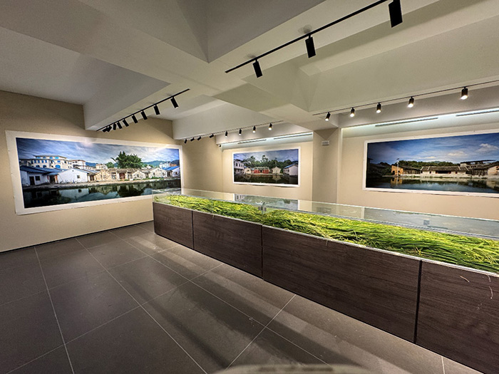 在米香中心二层是何崇岳的摄影作品《风水蕉岭》,何崇岳是一位观念摄影艺术家,他从卫星云图上查看以蕉岭的水系分布,从而发现并拍摄了几座在水边的围龙屋建筑,作品以正面角度展示了围龙屋令人惊叹的外观,这些庄严中不失华丽的建筑影像如一幅幅静默的建筑肖像,无声地向观众诉说着客家先民厚重悠远的历史,宗族记忆、防御智慧与生活往昔。