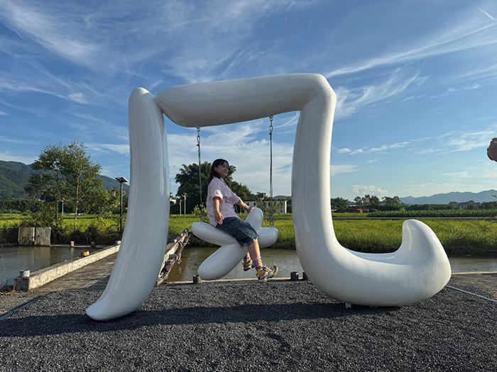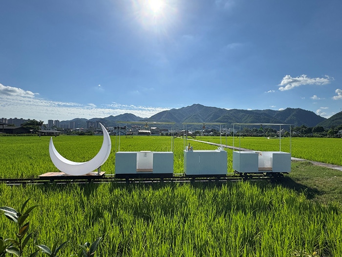 最先映入眼帘的,是稻田中的“小火车”,这是艺术家刁勇(不是美术馆)的作品《稻田里移动的酒吧》,艺术家将火车头被巧妙设计成一轮皎洁的“明月”,车厢则化身为精致的小型酒吧。游客可以坐在移动的吧台上,一边品尝以客家米酒调制的特色饮品“硒望”,一边与同伴畅谈欢笑。伴随着蒸汽与稻香,小火车缓缓驶过田间,带来一种独特的田园慢生活体验。