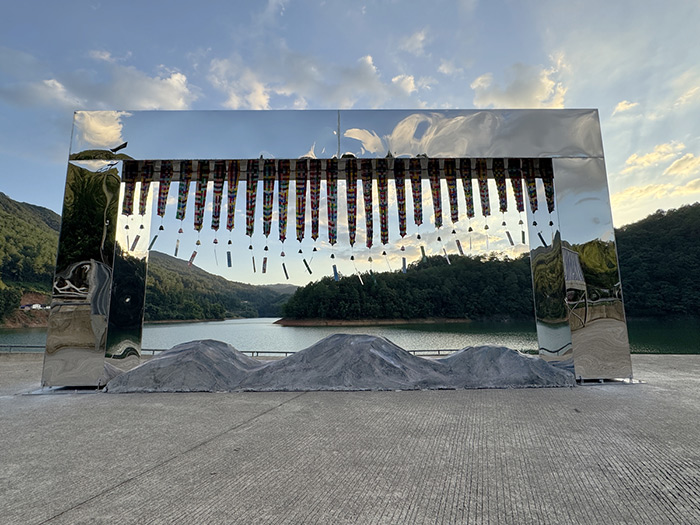 许仲敏的《悬天之镜》与臧嘉的《十二滴眼泪》皆以镜片为媒介,与蕉岭山水展开对话。《悬天之镜》由一座不锈钢梯与直径7米的镜面组成,镜片随风摇曳,白日捕捉云光,夜幕点亮星辰,观者在攀登与映照中仿佛与天地融为一体。《十二滴眼泪》则在田野与溪畔放置十二面可触可变的镜片,远观如凝固的露珠,映照自然细节,触碰间又随力扭曲重组,赋予人与环境互动的诗意体验。两件作品一虚一实,共同引领观众在光影与触感中重新感受自然与生命的深意。