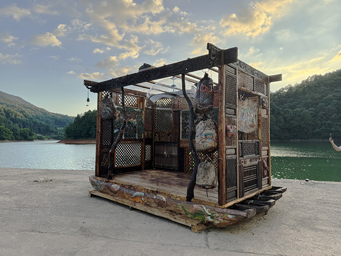 郑泽生的《摩梭精灵》带来云南的气息。他以泸沽湖八条猪槽船为基底,将雕花老木板、茶马古道上的皮具、铜铃等旧物拼贴成一座“船屋”。观众在其中可细细观察窗棂上的雕花、丽江地区的动植物纹样、牛皮皮具的肌理。这艘漂浮般的“船屋”,为观者提供了一个异形的多元空间视角,也让文化记忆在流动与拼贴中寻回扎实的根脉。