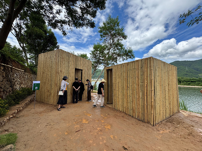 渠岩的《呼吸山方》以当地毛竹搭建了两座竹屋。观众可以步入其中,坐在竹椅上品茶,欣赏眼前开阔的山水景观和傍晚时分洒落竹壁的斑驳光影。屋顶自有精妙,其上勾画着梅州地图,其中镂空处正是蕉岭县的形状,那一角绿树与天光就在蕉岭的地形中自然呈现。作品不仅巧妙回应了蕉岭自然的主题,更让观众在半密闭空间感受到风的呼吸与光影的流动,体悟天地秩序与人类诗意的栖居。