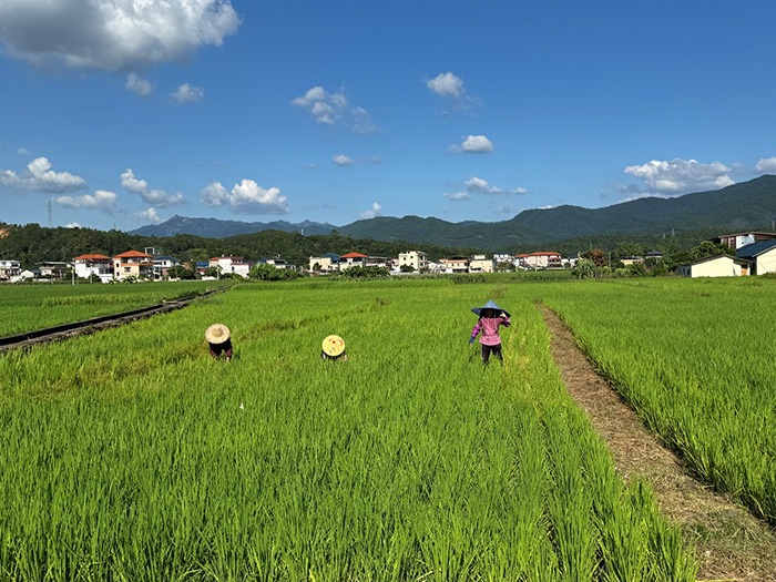 长潭镇白马村的米香中心,是众多游客必到的打卡点。这是一座以客家民居建筑风格为底色的民宿,米香中心四周环境优美:前方是大片碧绿的稻田,青涩的稻穗随风摇曳;远方群山起伏,白墙灰瓦的客家民居点缀在蕉林间。行走在田间小径上,空气中弥漫着稻香,天地静谧安然。稻田之间,艺术家许钟敏、刁勇、袁泽强、杨千等艺术家的作品,将这片南国田园的诗意与浪漫呈现得淋漓尽致。