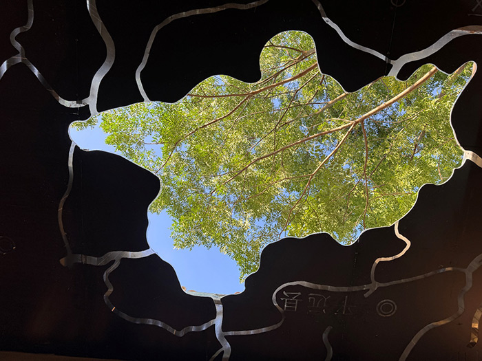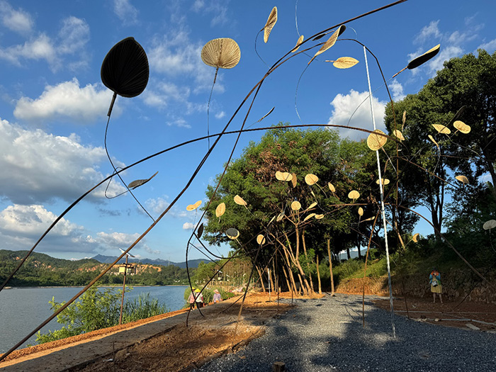 戴耘的《轻风扇舞》远看似一棵缀满鸟窝的巨大藤蔓,走近看这是由钢筋与软管形成的“枝蔓”,尾端系上蒲扇。微风拂过,扇叶轻摇,阳光下投下修长的影子。作品以旧扇与现代材料的结合,在蕉岭风土中自然绽放,唤起观众对前空调时代人与自然同频呼吸的记忆以及内心的宁静。