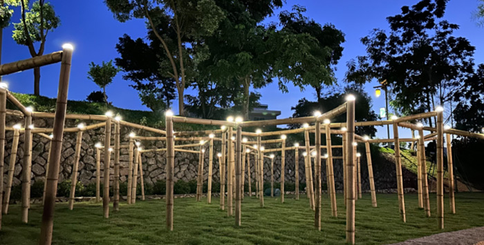 安晓彤,《光栖竹境》,尺寸可变,综合材料(竹竿、灯等),2025年