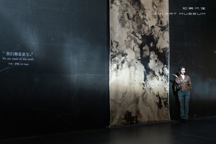 《岷江图》则以十米长卷的恢宏气势,将地域水文与星象宇宙相连,展现其“在地性”与“宇宙观”的双重关怀。它与《星宿海——银河》组成的20⽶⻓卷落于知美术馆⼀层展厅,环抱成园,恍若太极,于空间上呼应成都西南“⽔城新津”岷江⽔域的地理脉络,于理念上演绎中国古典哲学中天上星宿与天下河流之分野映照的深刻关联。